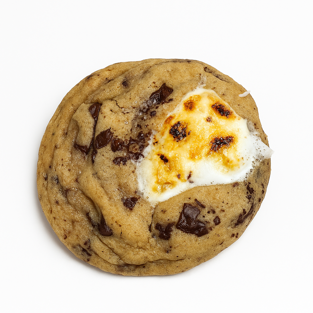 A gooey campfire dream. Brown-butter cookie dough loaded with graham sweetness, stuffed to the center with melty marshmallows and rich dark chocolate. A toasty, nostalgic bite with every pull.